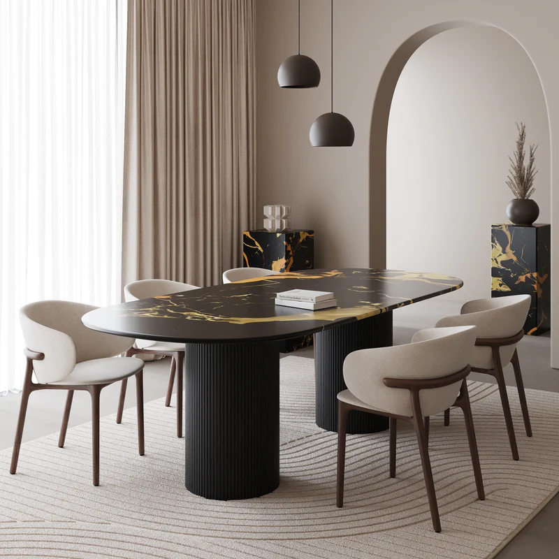 Half oval marble dining table – Black oak double ribbed cylinder leg