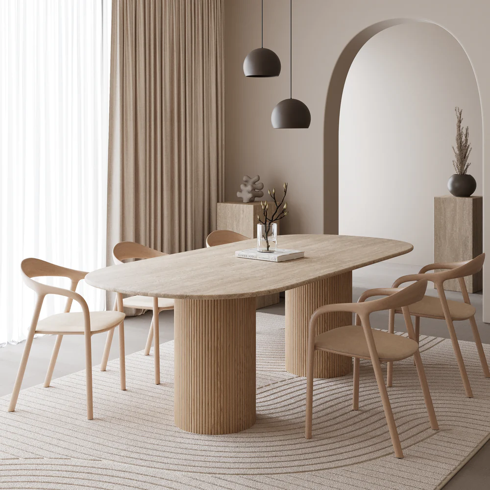 Half oval marble dining table – Light oak double ribbed cylinder leg