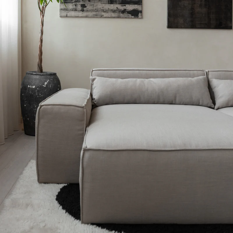 Inside, Malin is made of certified wood and filled with a soft down and feather filling, which is sewn into strips to extend lifespan and maintain the iconic shape. Cozio can be manufactured in 4 different set-ups to create the right seating area in your home. The fabric is a thick Polyester / linen fabric that looks beautiful and sturdy together with the upholstery finish. Cozio is available in almost any color to your liking. A timeless lounge design.